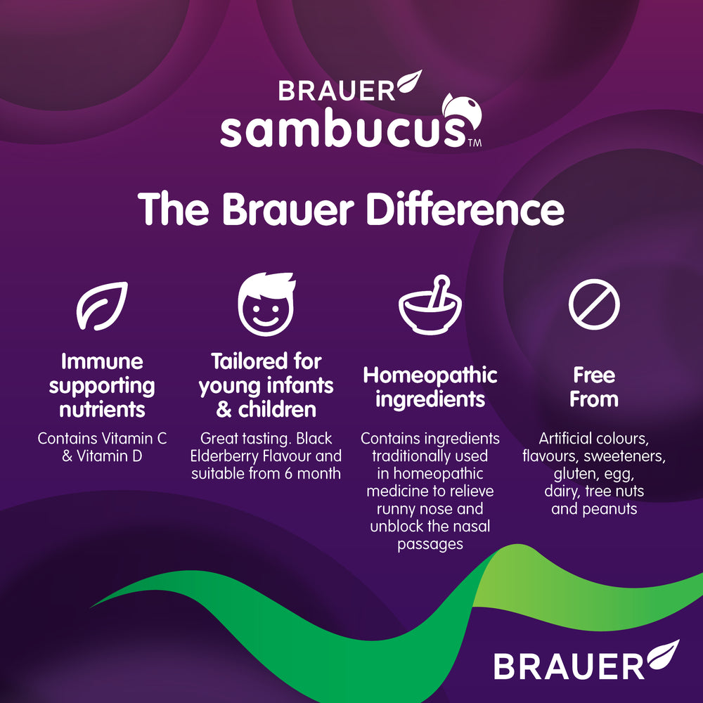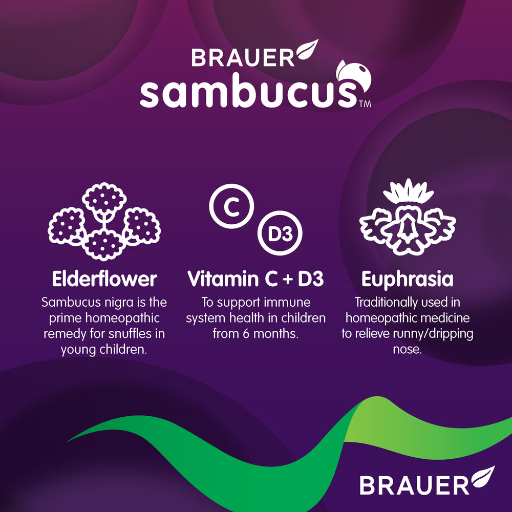 Brauer Sambucus Little Sniffles contains ingredients traditionally used in Homeopathic medicine to relieve runny nose (Elderflower) & symptoms of sore throat (Allium cepa), partnered with vitamin C and D to support immune system health in children from 6 months of age.