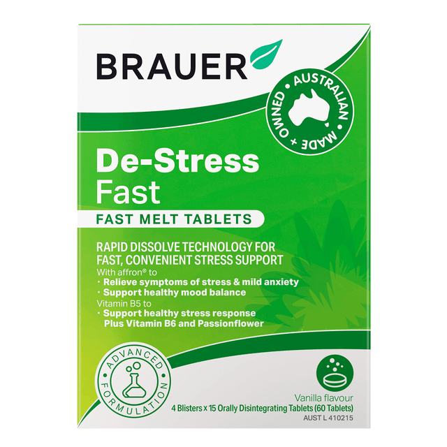 Brauer’s De-Stress Fast is a unique combination of selected B Vitamins & active herbs in a rapid melt tablet for fast and convenient stress support.